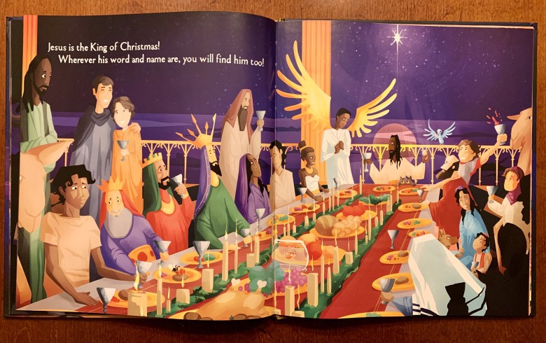 On almost every page you will find the same question, “Is the King of Christmas there?” Children thrive on predictability. The book’s repetitive questions draw children in and help them think through the questions. At first it is easy. No, he is not in the sky, or among the fish in the sea, or the beasts, and I guess since he wasn’t there he’s not among the rich (they begin to see the pattern). Then of course, when you arrive at the birth, Jesus is there! Finally, a Yes! But his story doesn’t stop there. In Matthew 2 the Magi asked Herod where the “King of the Jews” was born (2:2). When he was hanging on the cross, a sign is placed above Jesus stating that he is “King of the Jews” (27:37). The King of Christmas is found there too. But… is he found in the grave? Now children must think. Is it No? Yes? Well, the picture certainly helps as is shows everyone looking into an empty grave.
