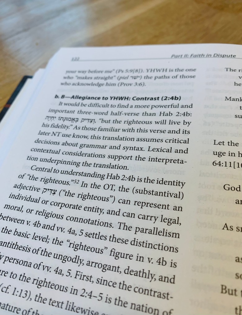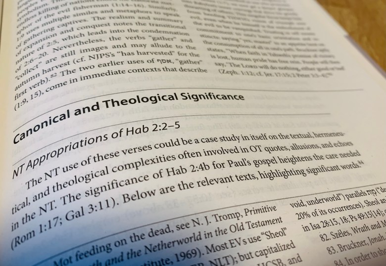 Many Christians are familiar with Habakkuk because Paul uses Hab. 2:4 in Romans 1:17 and Galatians 3:11, and probably because of the last few verses in Habakkuk where Habakkuk lays his trust in the Lord’s goodness and faithfulness (3:16–19). However, Turner writes that there are numerous hermeneutical challenges to Habakkuk. A number of words have flexible meanings (does emunah/pistis mean “faith,” “faithfulness,” or “fidelity”), different text traditions lie behind certain words, and Hebrews 10:37–38 uses Hab. 2:3–4 differently from how Paul uses it.