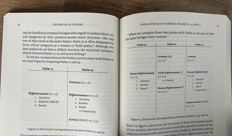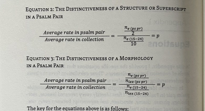 For example, she identifies every repeated element (word roots, lexemes, phrases, themes, the psalm’s structure, the superscript, and the Divine name. She compares how often a word occurs within the collection vs. within a psalm pair (when two psalms closely cohere to each other) to determine whether that psalm pair is intentionally linked.