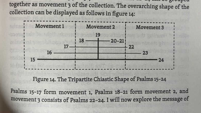 In chapter one, Quinn introduces her work and aim, gives insight into the design of the psalter, and reviews the history of Psalms study. Why make a big deal about these ten chapters? Reading the Psalter as one unified book intentionally arranged to tell a story has become increasingly popular over the last few decades, and Quinn’s work adds to the evidence that this is so. Quinn writes that examining these ten psalms “challenges the tendency to read psalms as isolated units by raising various questions” (1). There are “only two entrance liturgies in the entire Psalter,” and they kept close together, Psalms 15 and 24 (1–2). The phrase “I/he will not be shaken” occurs five times in Book I of the Psalter. Four of these appear within Psalms 15-24. “The correspondence between Psalms 20 and 21 is striking: in Psalm 20, “the community petitions Yhwh to give the king his heart’s desire,” and Psalm 21, “the community rejoices that Yhwh has given the king his heart’s desire” (2). Are these merely incidental occurrences, or are they intentional links that bind these psalms together? And if these psalms, why not the whole Psalter?