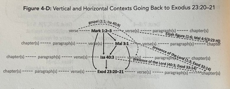 Despite all of the above, I highly appreciated the authors’ emphasis on how the two testaments are intimately connected. The New Testament authors faithfully interpreted the Old Testament, and Schnittjer and Harmon offer good and very detailed examples in the case studies at the end of each chapter. The authors distinguish typology from allegory and illustrations and show how you can tell (ch 6), they offer controls when searching for allusions, and they offer thicker readings of the text by showing how so many texts reuse earlier texts and theology. Throughout the book the authors give numerous examples to make their point, and the case studies bring those ideas together in order to examine a few specific texts. Here is an example of the vertical and horizontal context of Mark 1:2–3, which was the case study from chapter one (pp. 20–22). Although, I think the vertical context here could have gone one step further back. According to Jim Hamilton in his book Typology, Exodus 23:20–21 and the reference to God’s angel being sent before Moses and Israel alludes back to Genesis 24:7, where God will send his angel before Abraham’s servant in order for him to find a wife for Isaac.
