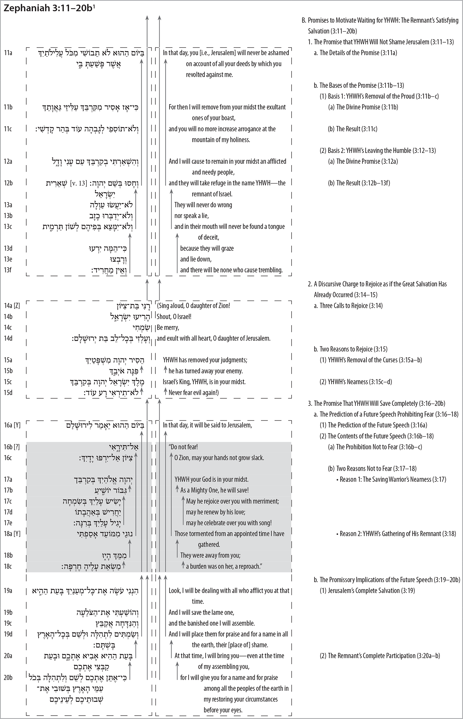 One helpful example of DeRouchie’s method comes in his analysis of Zephaniah 3:11–20. Here is an example of his exegetical outline.